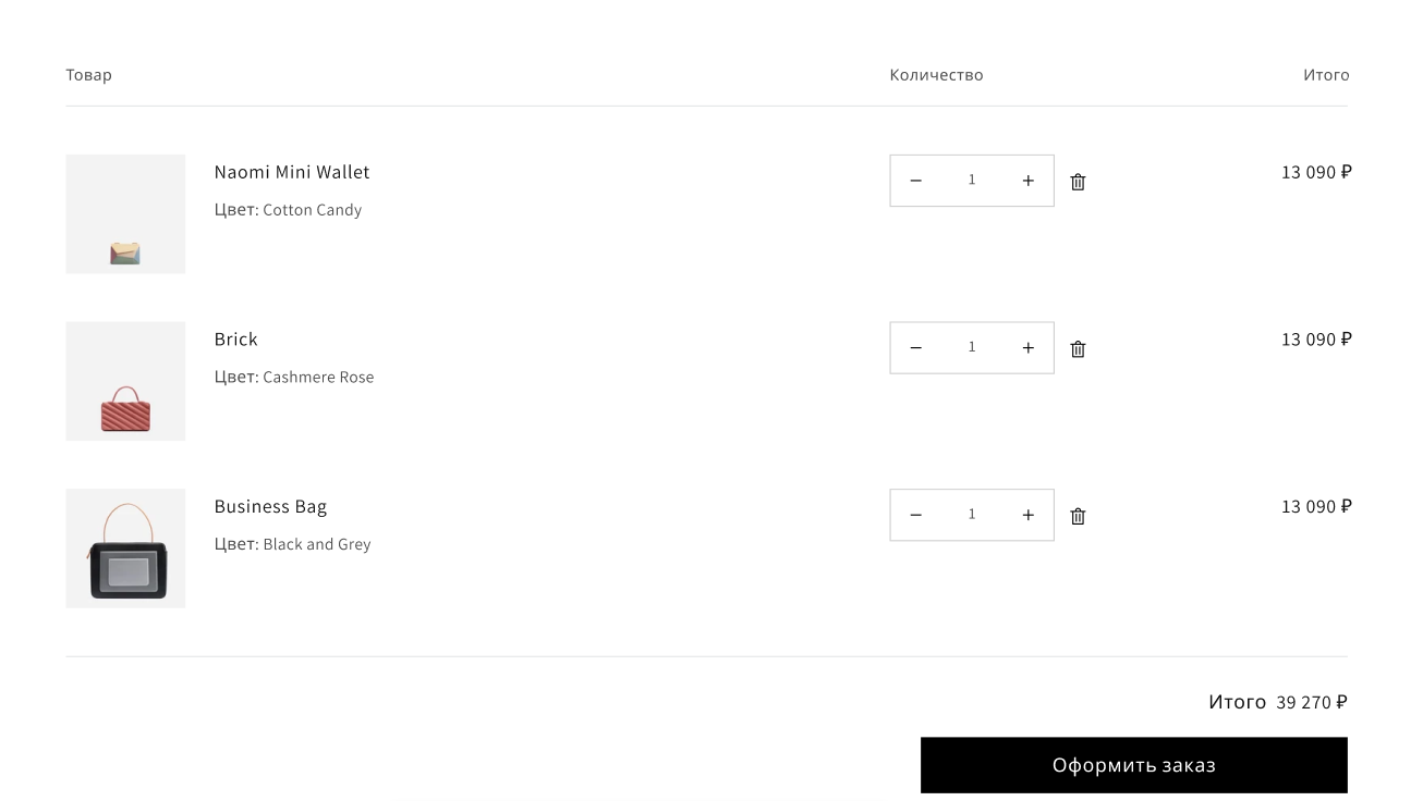 Собрали корзину в лаконичном формате: список позиций, быстрые изменения количества, удаление и прозрачный итог. Всё ведёт к одному логичному действию, что повышает завершение покупки.