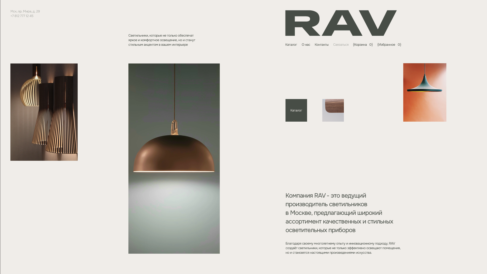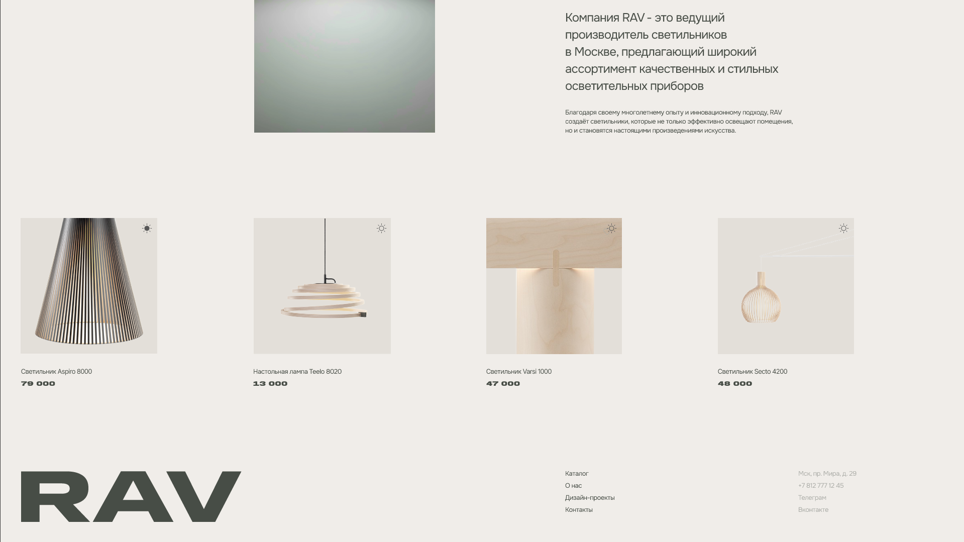 RAV — имиджевый лендинг производителя дизайнерских светильников, фокусирующийся на визуальной подаче продукта, бренде и презентации ассортимента в премиальном сегменте.